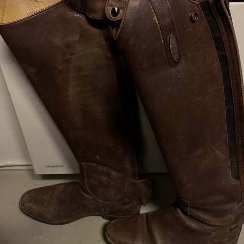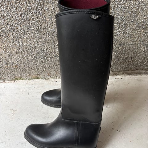 Ratsastussaappaat ovat mustat ja valmistettu kumimateriaalista. Malli on pitkävartinen.