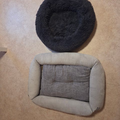 Pyöreä ja suorakaiteen muotoinen koiranpeti harmaana ja vaaleanbeigenä