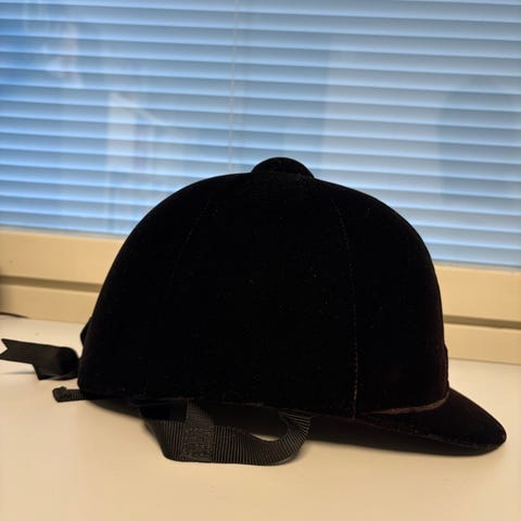 Euro Hunter ratsastuskypärä mustassa värissä. Kypärä on valmistettu samettimaisesta materiaalista ja siinä on säädettävä leukahihna. Sisäpuolella on pehmuste.