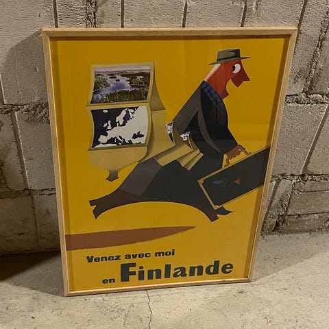 Alvar Aalto Exhibition -juliste, jossa on graafinen vihreä ja sininen muotoilu. Juliste on osa yliopiston taidegallerian ja arkkitehtuurikoulun näyttelyä, joka pidettiin University of Texas at Arlingtonissa tammikuussa ja helmikuussa 1980. Nyt lähes kehysten hintaan tarpeettomana. Koko 100/70cm. Lähetän sovitusti.