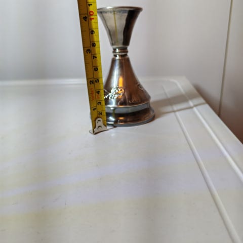 Hopea kynttiläjalka jonka Kultakeskus, Hämeenlinna valmisti vuonna 1968. Koristekiviä kolme kappaletta ja vihreä risti, jossa teksti: labor et sanitas 1945. Signeeraus RS (Reijo Sirkeoja). Paino 148,7 gr. Korkeus 4,5cm ja leveys 6,5cm ja yläosassa 5cm.