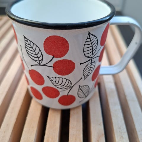 Finel Kirsikka -sarjan emalikasari, jonka on suunnitellut tunnettu suomalainen muotoilija Esteri Tomula.