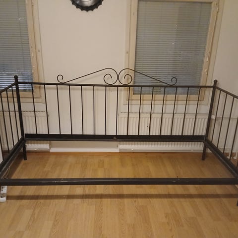 Sopiva kahdelle 90 cm x 200 cm kokoiselle patjalle. Sängyn pohjan korkeus 21 cm, reunat 25 cm lattiasta.