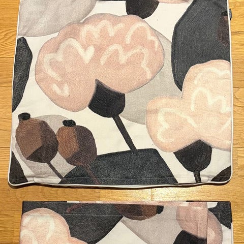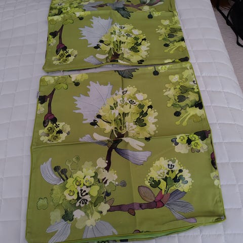 Tyynynpäälliset koko 45x45 cm puuvillaa. Kaitaliina koko 46,5x155 cm puuvillaa akryylipinnoite. Käytetty ehkä kaksi kertaa. Hinta 25 euroa kpl.