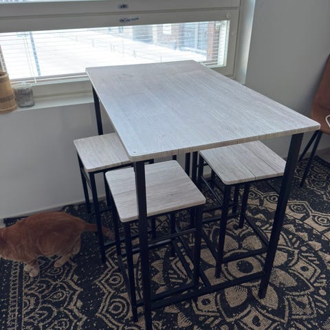 Kompaktiin tilaan mahtuva ruokailu setti. Pöydän ja jakkarien korkeutta pystyy säätämään oman halun mukaan. Ollut yksiössä käytössä ja on ollut kunnon tilaihme. Setissä selkeitä käytön jälkiä, mutta kokonaisuus näyttää silti tosi hyvältä. Myydään muuton alta pois. Hinta on neuvoteltavissa. Lähialueille mahdollisesti myös kantoapua.