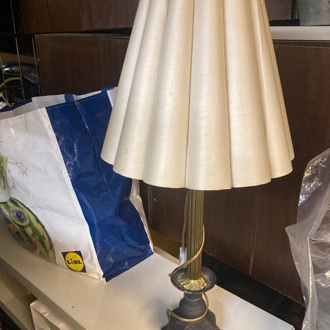 Antiikkinen pöytävalaisin hapsuvarjostimella. Toimii. Huom. johto maadoittamatonta mallia.