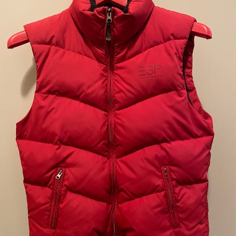 Tummansininen toppsliivi, kuin uusi, ollut parikertaa päällä, itselle vähän iso. Sivuissa vetiketjut samoin taskuissa, huppu ja sisäpuolella myös tasku. Pituus hartia helma 65cm , kainalo/ kainalo 54cm