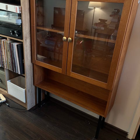 Hakusanat: lasiovet, kulunut, käytetyt huonekalut, vintage huonekalut, kuivuma, puu, vintage, retro, hyllykkö, säilytys, sisustus, teak, hyllyt, vitriini, huonekalut, käytetty