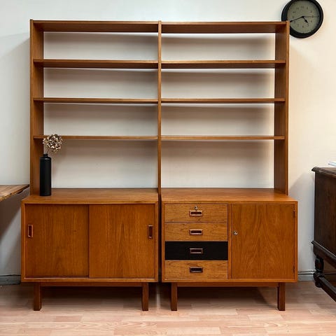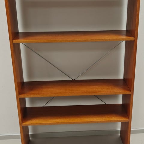 Vintage 60/70 luvun hyllykkö, jossa on useita hyllytasoja ja lasiovellinen vitriini. Teak-viilupinta antaa lämpimän ilmeen. Vitriinin sisällä erikoinen lasitaso. Tämä hyllykkö edustaa ajattoman muotoilun ja käytännöllisyyden yhdistelmää.