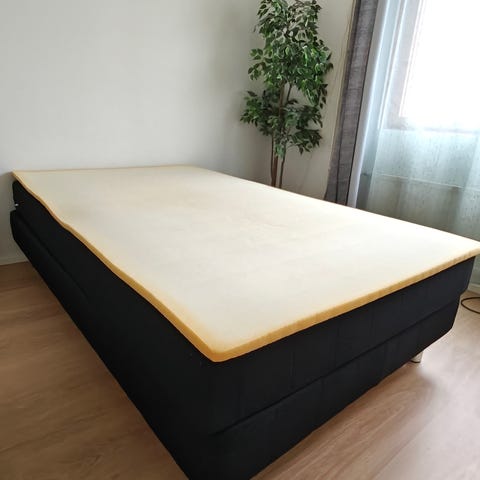 Mukava sänky, patja ja petauspatja. Leveys päätyjen kanssa 132 cm. Korkeus korkein puuosa 110 cm. Haku Siilinjärvi Panninniemi.