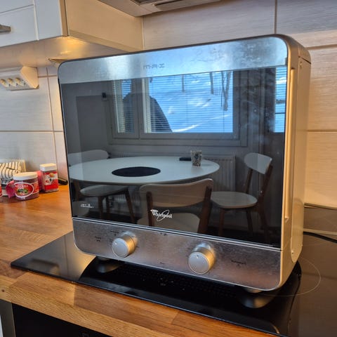 Alle vuoden käytössä ollut Whirlpool mikroaaltouuni. Edessä toinen jalka rikki, seisoo vähän vinossa.