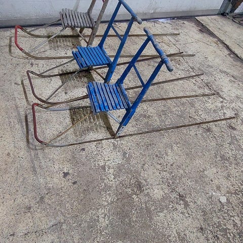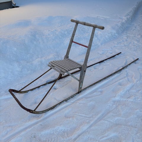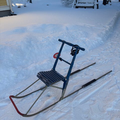 Lähes käyttämätön potkukelkka, korkeus 86cm pituus 160 leveys noin 40-45cm