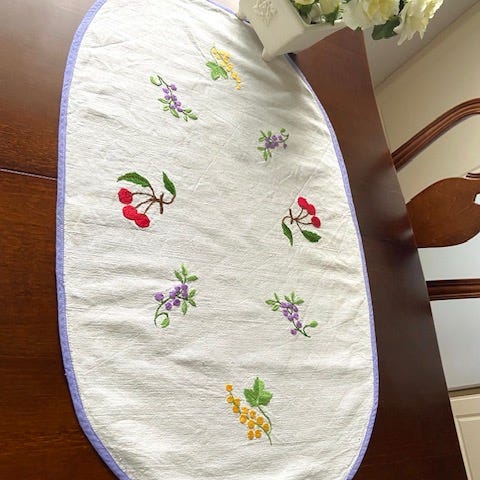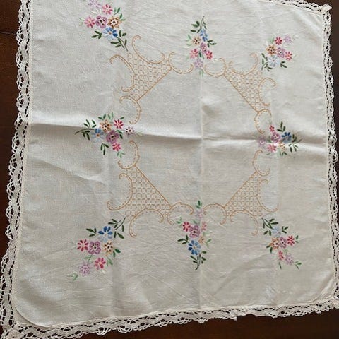 Kirjottua pöytäliinaa, pellavakangasta . Koko.67x63cm