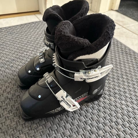 Lasten Salomon T2 laskettelumonot, koko 19/240 (vastaa kengänkokoa 31). Värit harmaa ja valkoinen. Säädettävät soljet ja pehmeä sisus mukavuutta varten.