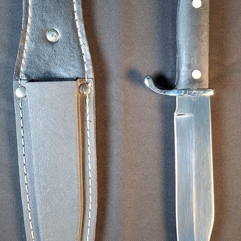 Myydään kuvan kaunis veitsi kaiverruksin. Veitsen mukana tulee upea rasia. Terässä lukitusmekanismi.