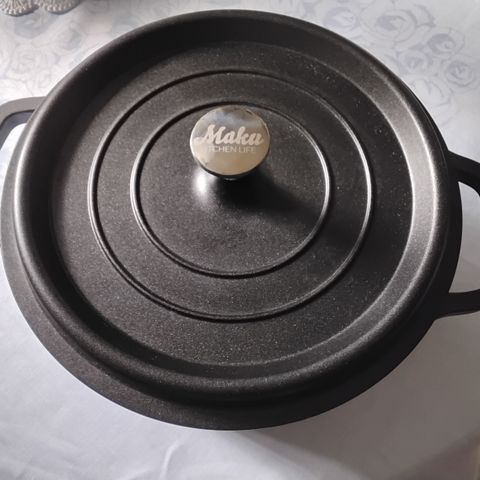 Pitkä emaloitu pata. Hieman käytön jälkiä kuten kuvasta näkyy. Verrattain siisti.