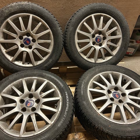 Saab orkkis vanteet ja nastarenkaat. Pintaa todella hyvin jäljellä nastoja poikki.