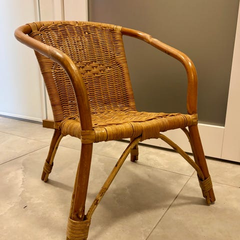 Myydään rottinkinen lasten kiikkustuoli. Istuinosan leveys 34 cm ja korkeus edessä 34 cm, selkänojan korkeus 71 cm. Keinu ei kaadu helposti kiikkuessa, koska takajalakset ovat riittävän pitkät. Jalasten alle on asennettu huovat. Kunto hyvä. Yhden rottingin kiiltävä päällipuoli on irronnut 3 cm matkalta, mutta rottinki on edelleen tukevasti kiinni tukirakenteessa.