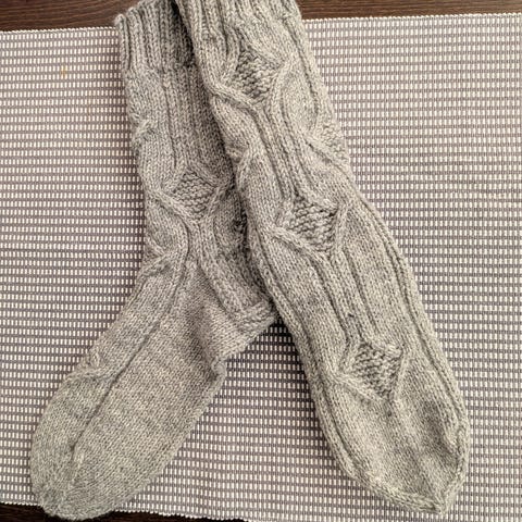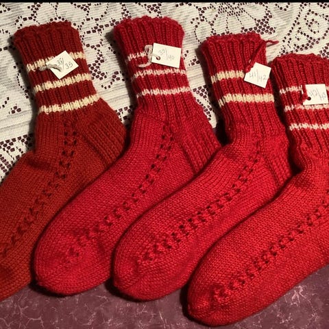 Sukat on neulottu 7 veljestä langasta, 75 - 80 % villaa / 25 - 20 % polyamidia, ovat kokoa 39-40 . Terän pituus 25 cm cm ja varren pituus 19 cm ennen.