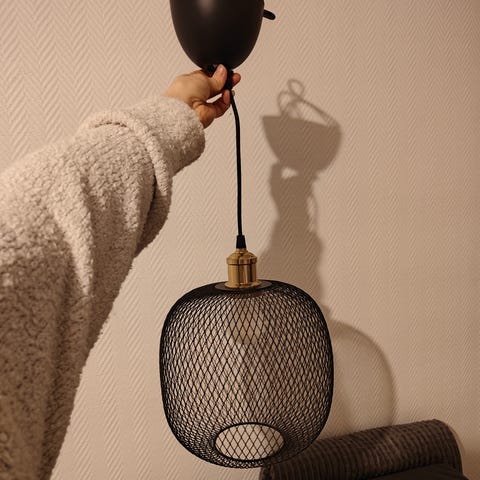 Pitkällä johdolla varustettu valkoinen kattovalaisin RGB WiFi -lampulla.
