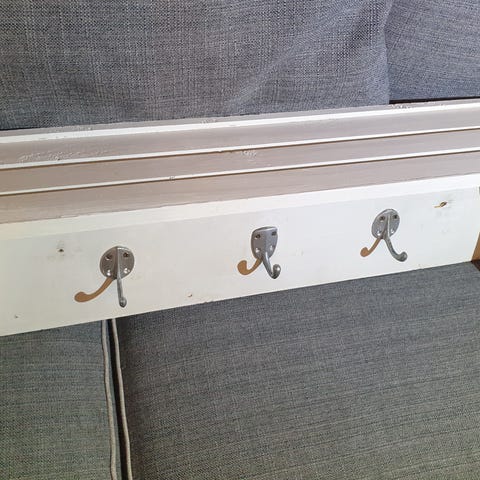 Kuvien mukainen vanhempi puunaulakko. Syvyys 290mm x korkeus 260mm x leveys 1250mm. Seitsemän koukkua ja piilokiinnitys.