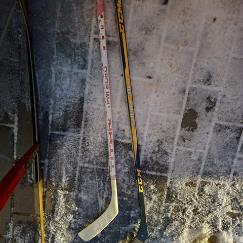 Kaksi puista jääkiekkomailaa. Vanhoja, mutta täysin ehjiä. Molemmat n. 160cm pitkiä.