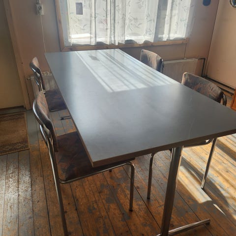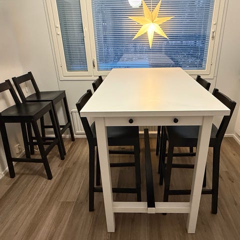 Ruokapöytä ja 4 tuolia. Pöytä on jatkettavaa mallia. Laadukas ruokaryhmä. Pöytä ovh. 1027€ tuolit ovh. 129€.