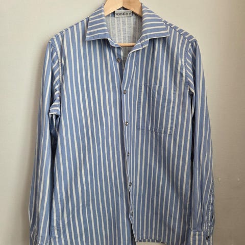 Marimekon harmaa-tummanharmaa-raitainen jokapoikapaita. Vanhempi malli: materiaali paksua puuvillaa (kestää pesun 60 asteessa), valmistettu Suomessa. Kokomerkintä 47 (mahdollisesti naisten?), sanoisin vastaavan miesten kokoa M. Ostettu käytettynä, todettu vääränkokoiseksi. Mieluiten nouto Käpylästä.