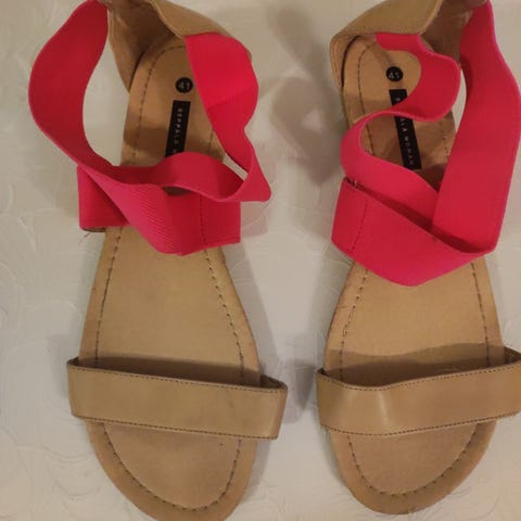 Beiget sandaalit, koko 39. Sandaalit ovat avomalliset ja niissä on koristeellinen yksityiskohta päällä. Pohja on musta ja liukuesteellinen. Sitä ei ole koskaan käytetty. Myynnin syy on, että se on minulle isompi.