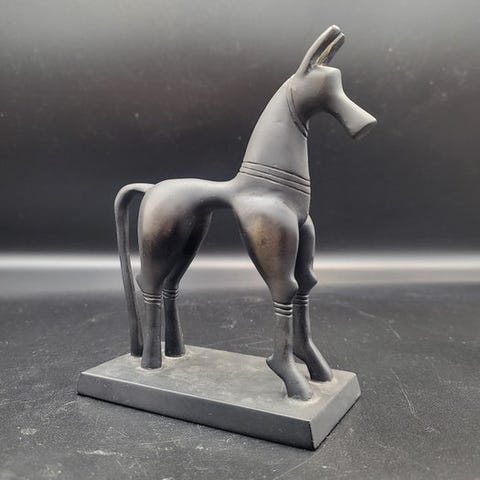 Siivekäs yksisarvinen -patsas, nimetty «Wings of Love», peräisin Franklin Mintin painoksista vuodelta 1991, kuten pohjan alla on merkitty.Tämä kappale on posliinista, ja siinä on emaloitu viimeistely, jossa on pastelliväreissä haalistuneita sävyjä, jotka herättävät tunteen pehmeydestä ja keveydestä.Siivet, sarvi sekä joidenkin yksityiskohtien päälle on lisätty 24 karaatin kultapinnoite, mikä luo tyylikkään kontrastin valkoisen ja värikkään posliinin kanssa.Yksisarvinen esitetään integroidun pilvisen jalustan varassa, mikä varmistaa hyvän vakauden ja vahvistaa teoksen ilmavaa ilmettä.Lavastus on siisti, ja tilavuuksien, harjan ja asennon kanssa on tehty tarkkaa työtä.Mahdollisesti lieviä käytön jälkiä iän mukana, ei suuria näkyviä vikoja (katso kuvat).Monet valokuvat ovat olennainen osa myyntiä.Ominaisuudet– Kustantaja: Franklin Mint– Malli: Wings of Love– Vuosi : 1991– Aihe: siipiyksisarvainen– Materiaali : emaloitu posliini– Viimeistely: kultapäällyste tai 24 karaatin kultaa– Kunto: erittäin hyvä yleiskuntoFranklin Mint, Wings of Love, siipiyksisarvinen, yksisarvinen, posliini, 24 karatin kultaa, koristefiguuri, keräilyesine.Hyviä huutoja Catawikissa!