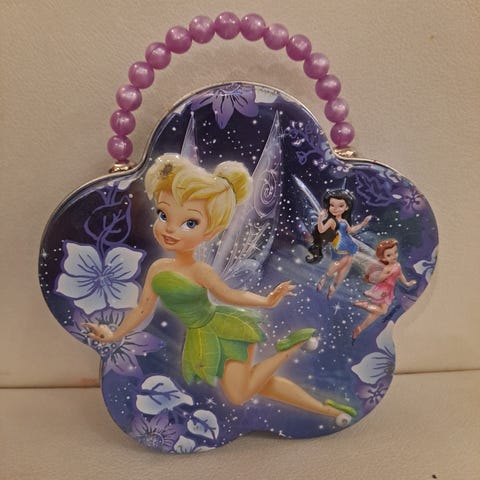 Disney Tinker Bell nukke, jossa on vihreä mekko ja vihreät kengät. Mukana kirkas muovinen tuki, jossa on tähti. Siivet valitettavasti puuttuvat.