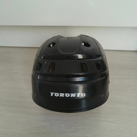 Toronto jääkiekkokypärä mustana. Kypärä on suunniteltu jääkiekon harrastamiseen ja tarjoaa suojaa pääalueelle. Varustettu kiinnityshihnalla ja pehmustetulla sisäosalla istuvuutta ja turvallisuutta varten.