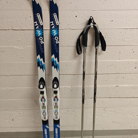 Lasten suksipaketti Salomon 140cm pitopohjalla, sauvat 95cm, monot Rossignol 36, siteet NNN