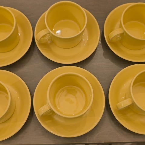 Vanhaa keltaista 5kpl isoja kahvi/tee kuppeja, 8kpl pieniä "espresso" kahvikuppeja, lautasia 8kpl. Osa Iittalan leimoilla, osa Arabian. Isoissa kupeissa perinteisesti lusikan hankaumia tämän värin kanssa jotka saa kyllä hinkattua pois halutessaan.