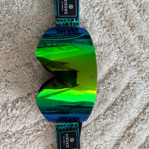 Julbo Aerospace laskettelulasit, joissa on valkoinen runko ja sininen linssi. Lasit on suunniteltu suojaamaan silmiä laskettelussa ja muissa talviurheilulajeissa. Varustettu säädettävällä hihnalla ja pehmustetulla sisäpinnalla mukavuutta varten.