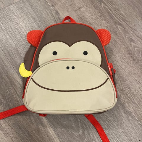 Reppu apinahahmolla, yksi vetoketjullinen tasku. Vähän käytetty joten hyväkuntoinen!