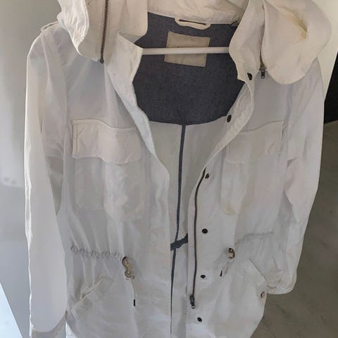 Kiva, rento malli, jossa kiristysnauhat vyötäröllä ja helmassa, läppätaskut neppareilla ja vetoketju, joka aukeaa kumpaankin suuntaan.