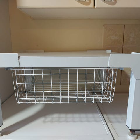 Valkoinen pyykkikoneen jalusta, kori alla ja säädettävät jalat.