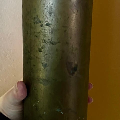 Vanha iso tykin (?) hylsy 5/1916 (?) Kuvissa merkintöjä. Korkeus 34,4cm halkaisija pohjassa 8,8cm ja yläosassa 7,8cm