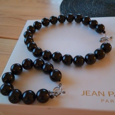Iso riipus onyx ja hopeaa, korvakorut hopeisilla koukuilla ja joustava rannekoru.