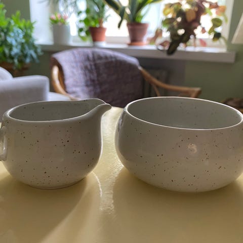 Myynnissä Pentikin Halla-sarjan hyväkuntoiset sokerikko ja kermakko. Sokerikon korkeus 5 cm ja suuaukon halkaisija 9 cm.