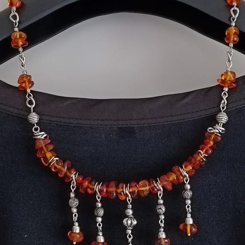 Korvakorut ja kaulakorun, joissa on luonnonvalkoista Baltian meripihkaa.