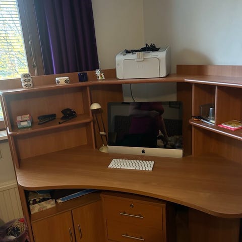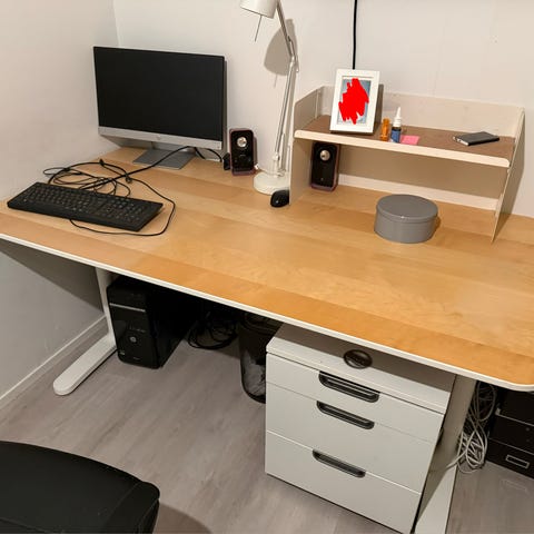 Ihan kohtalaisen kuntoinen työpöytä, lipastolla. Lipasto ei ole kiinni pöytään eli istuu vaan sen päällä. Käytönjälkiä on jonkin verran, on jonkin verran vanha