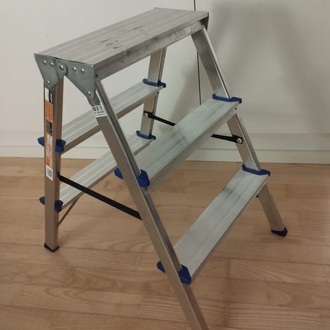 Metallinen 2-portainen tikkaat harmaalla värillä. Korkein askel 50cm maasta. Tikkaissa on kaksi askelmaa ja kädensija yläosassa. Sopii sisäkäyttöön ja kevyisiin nostoihin. Tikkaissa on maalijälkiä joita ei saa pestyä. Nouto Kontulasta.