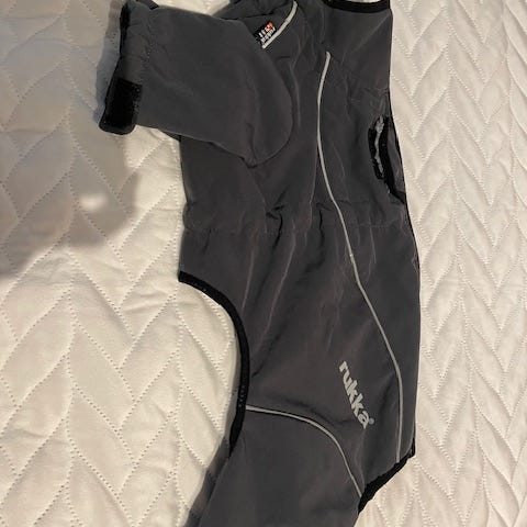Kuin uusi rukan talvihaalari koossa 45cm. Sisällä karvavuori. Selässä aukko hihnalle joten alla voi käyttää valjaita. Lahkeissa tarra kiristykset.