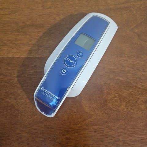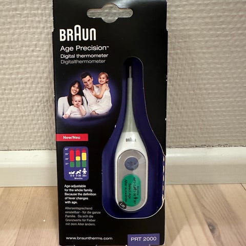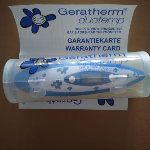 Paketissa oleva Geratherm Classic digitaalinen kuumemittari, valmistettu Saksassa.