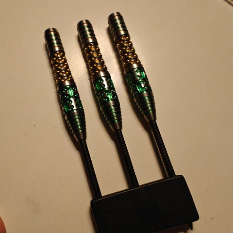 Kuvan muutamia minuutteja tauluun heitetyt tikat. Mulle ihan liikaa grippiä. Sulat, varret ja orkkisterät heittämättömät. Mukaan paikallaan olevat 35mm qp grippiterät.