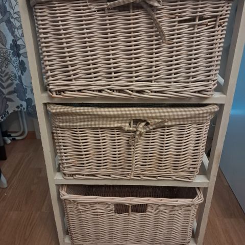 Seinähylly, rottinkia ja mustaa metallia. Korkeus 60,5 cm, leveys 36 cm, syvyys 11,5 cm. Melko kevyt. Nouto.