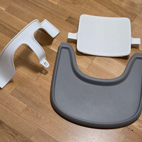 Myydään hyväkuntoinen Stokke Tripp Trapp -syöttötuolin babyset (ruskea) + tarjoitin (harma) ja pehmusteet.