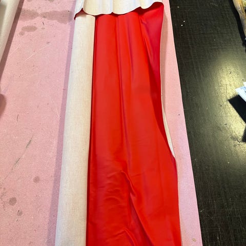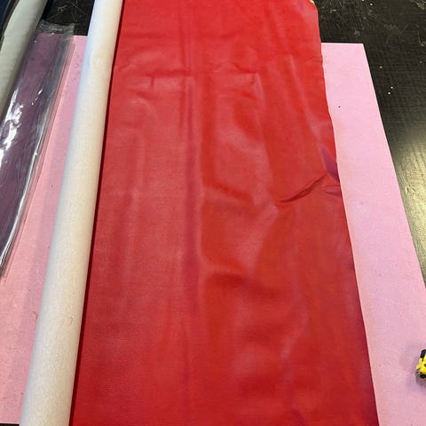 Vaaleanpunainen keinonahka, leveys noin 140 cm. Materiaali soveltuu esimerkiksi verhoiluun ja askarteluun.